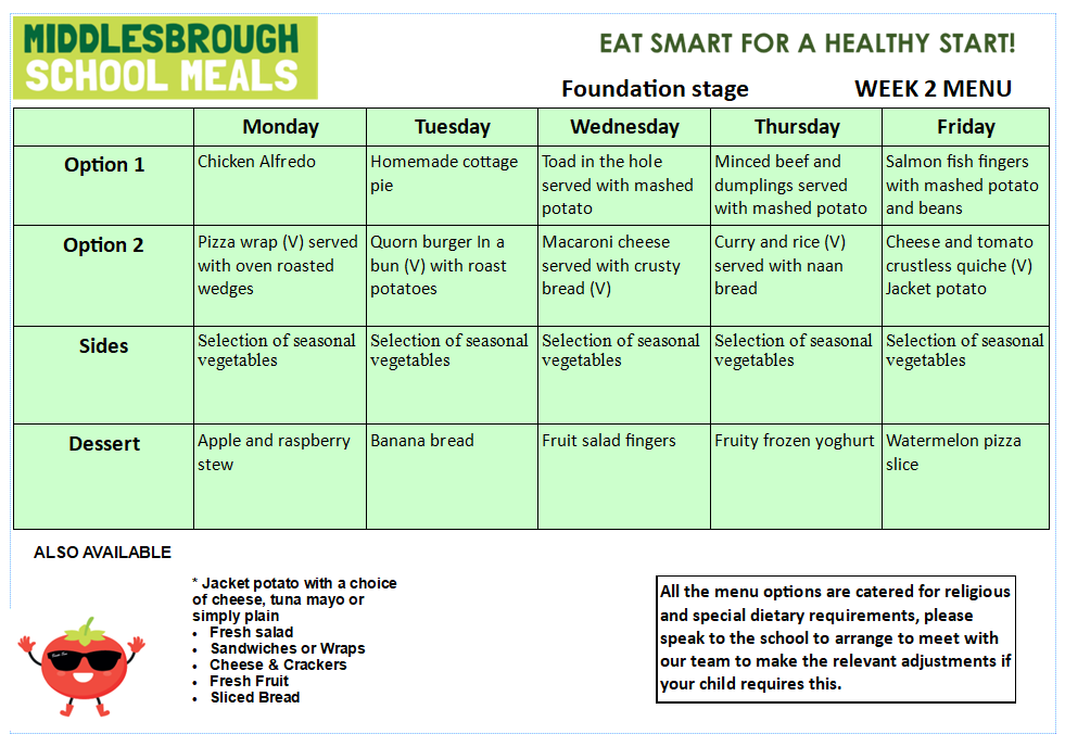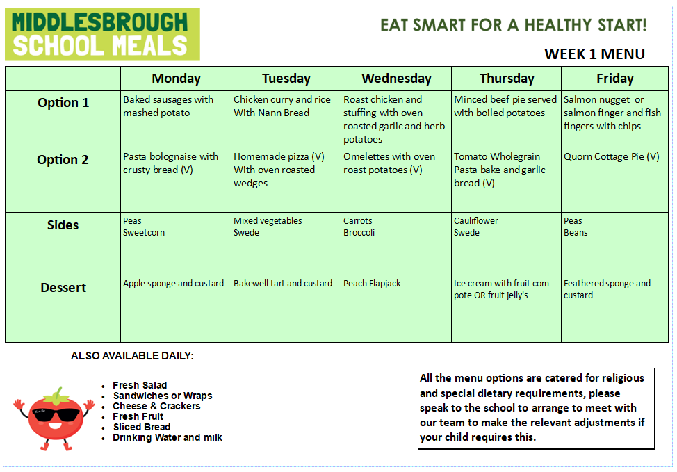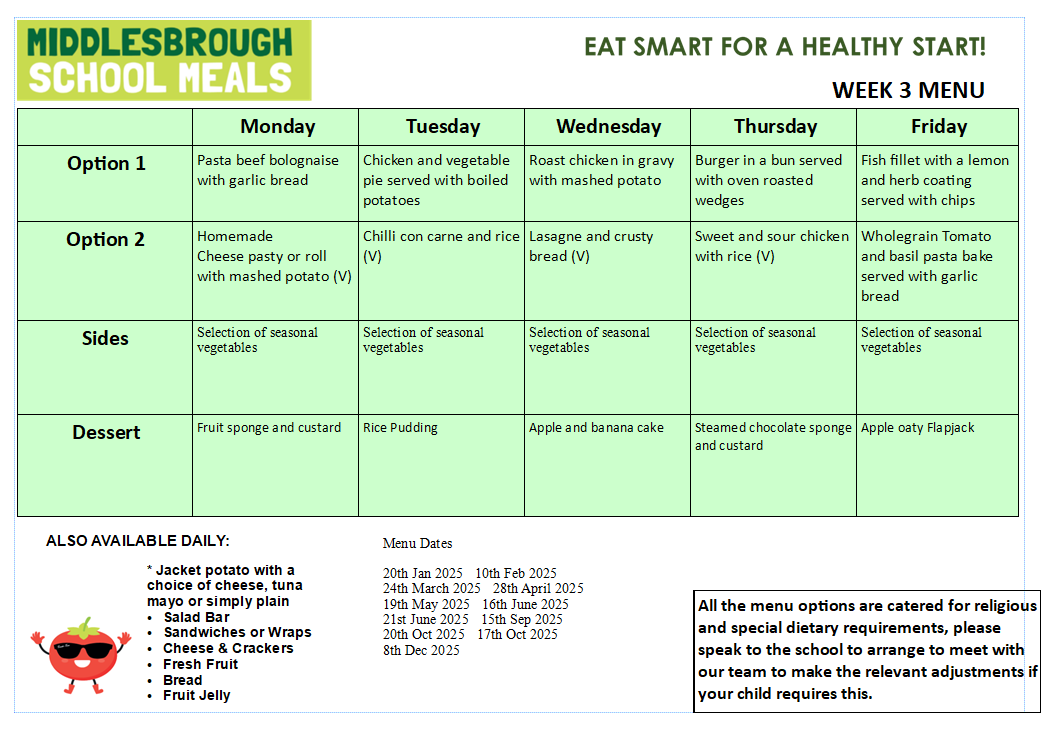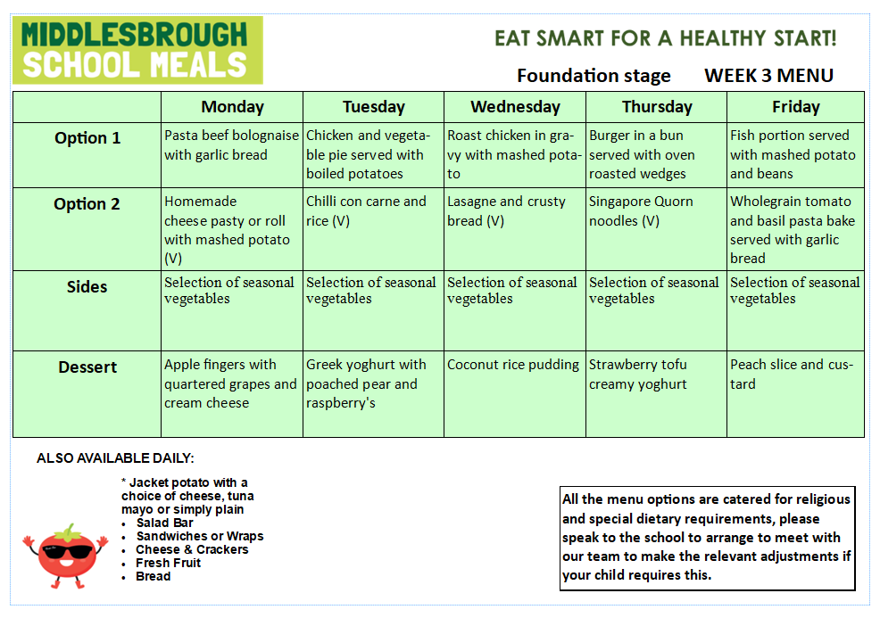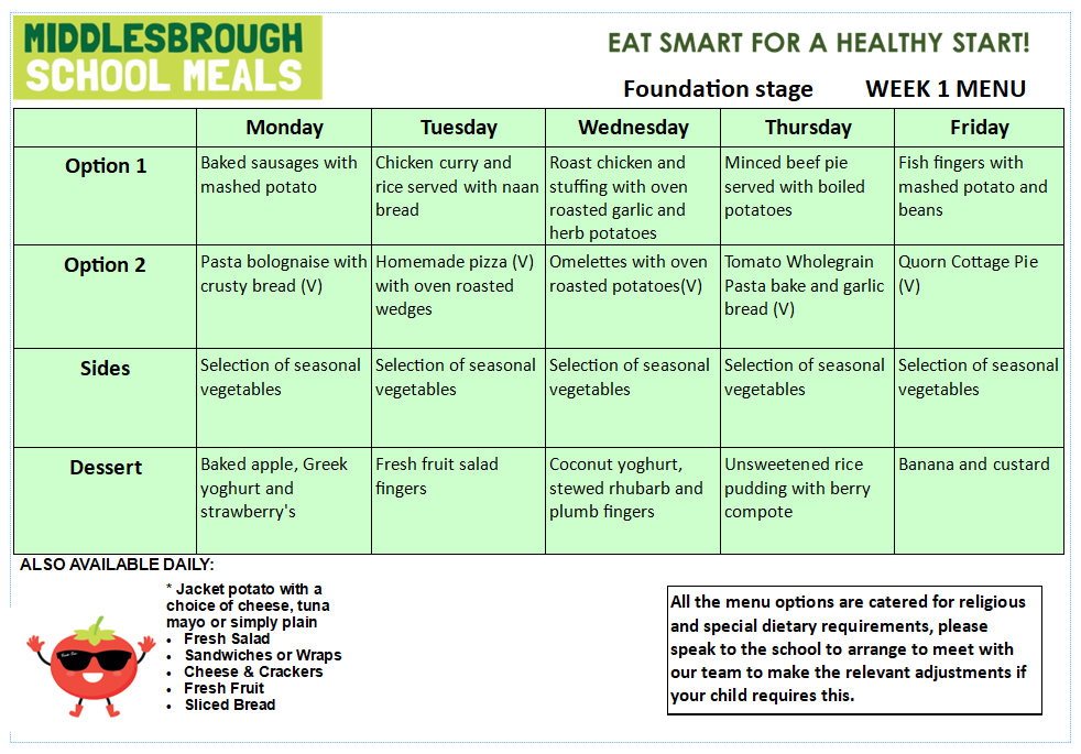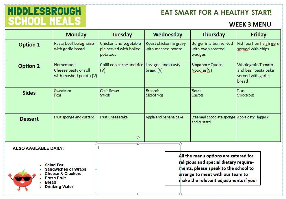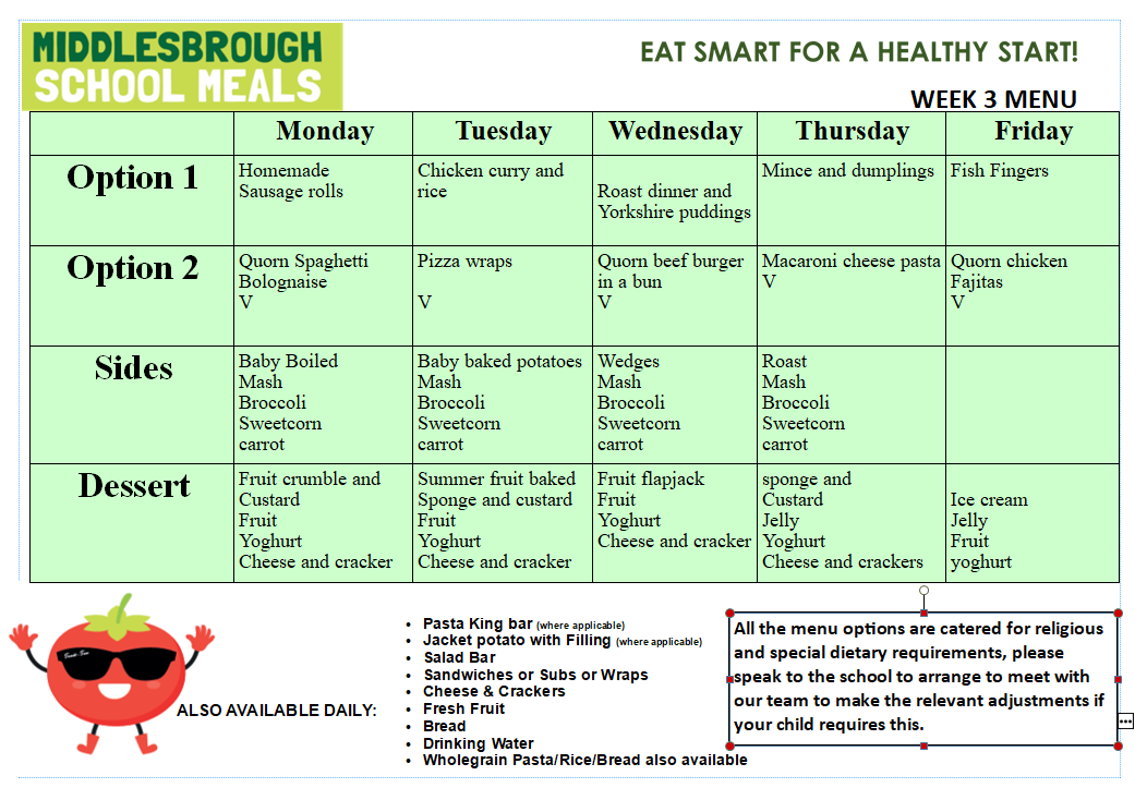 Meals are planned in a 3 week menu cycle. There is a vegetarian option daily as well as jacket potatoes and sandwiches. There is also a self-service salad bar which all the children can choose from.