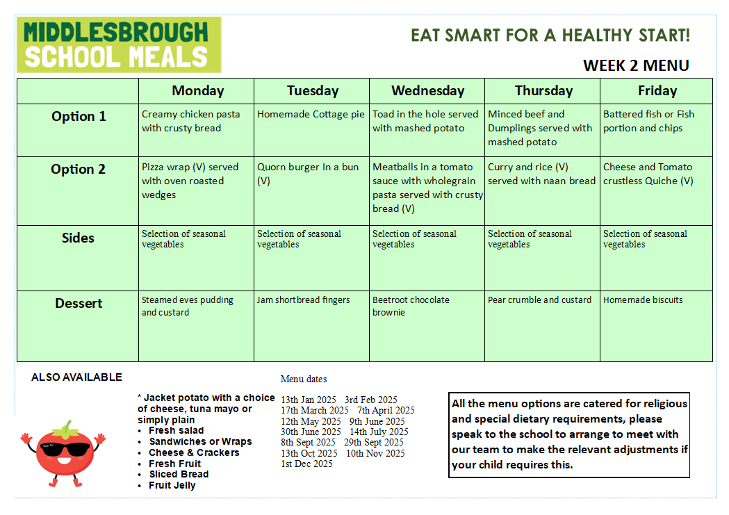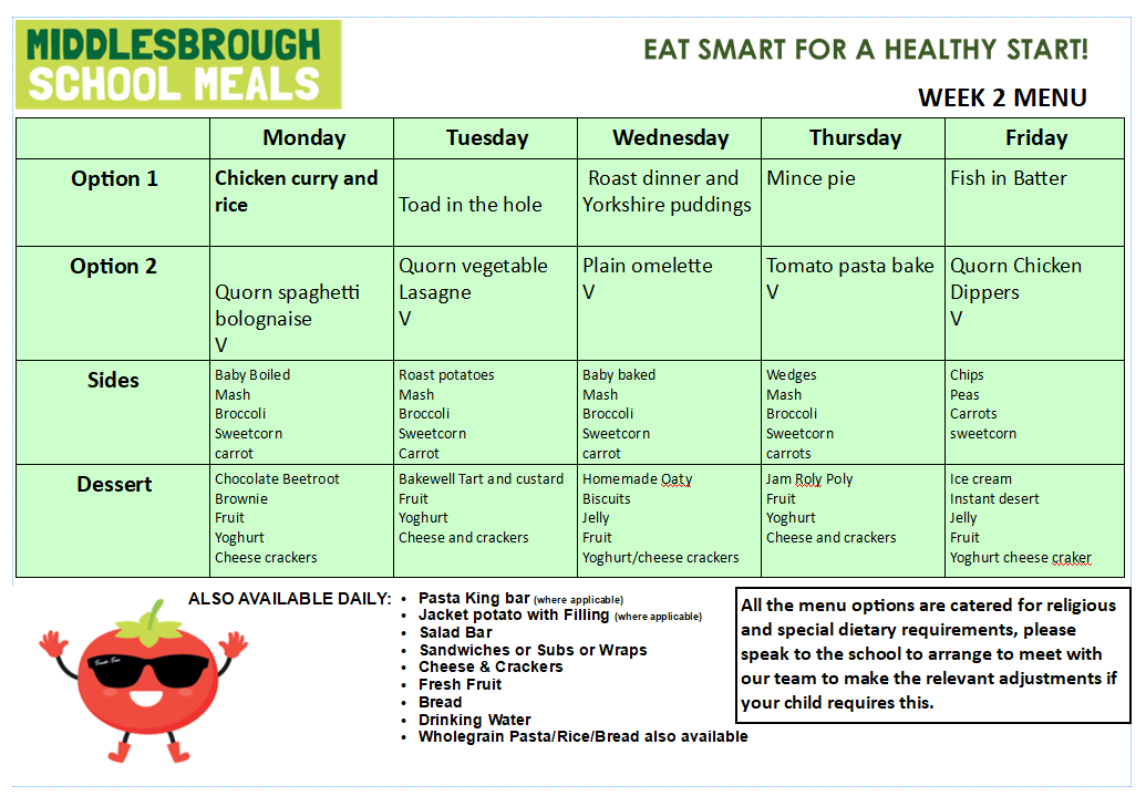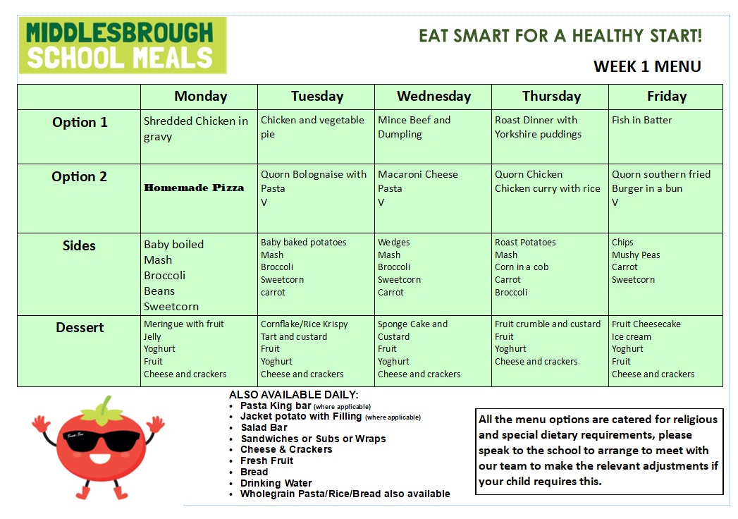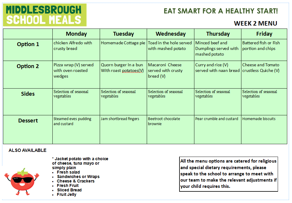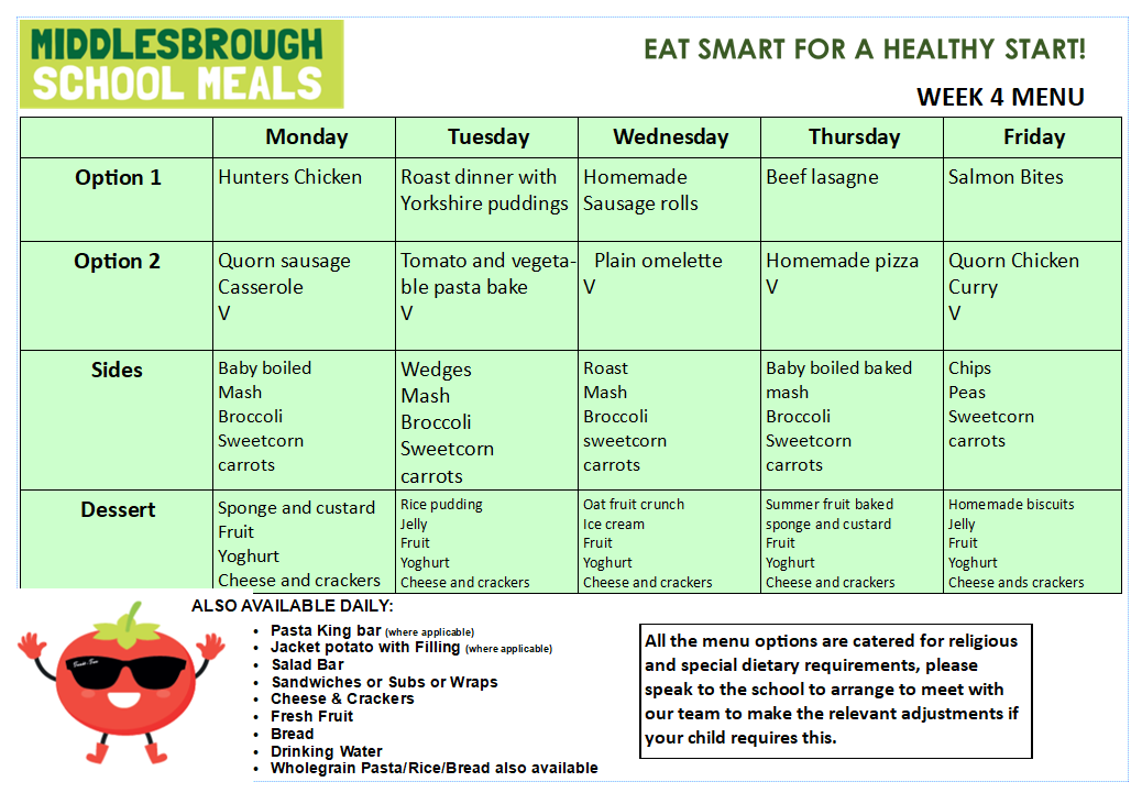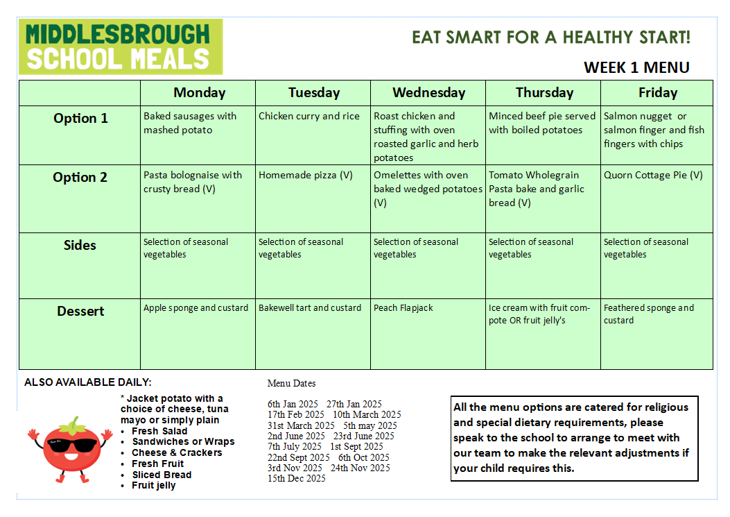 Meals are planned in a 3 week menu cycle. There is a vegetarian option daily as well as jacket potatoes and sandwiches. There is also a self-service salad bar which all the children can choose from.