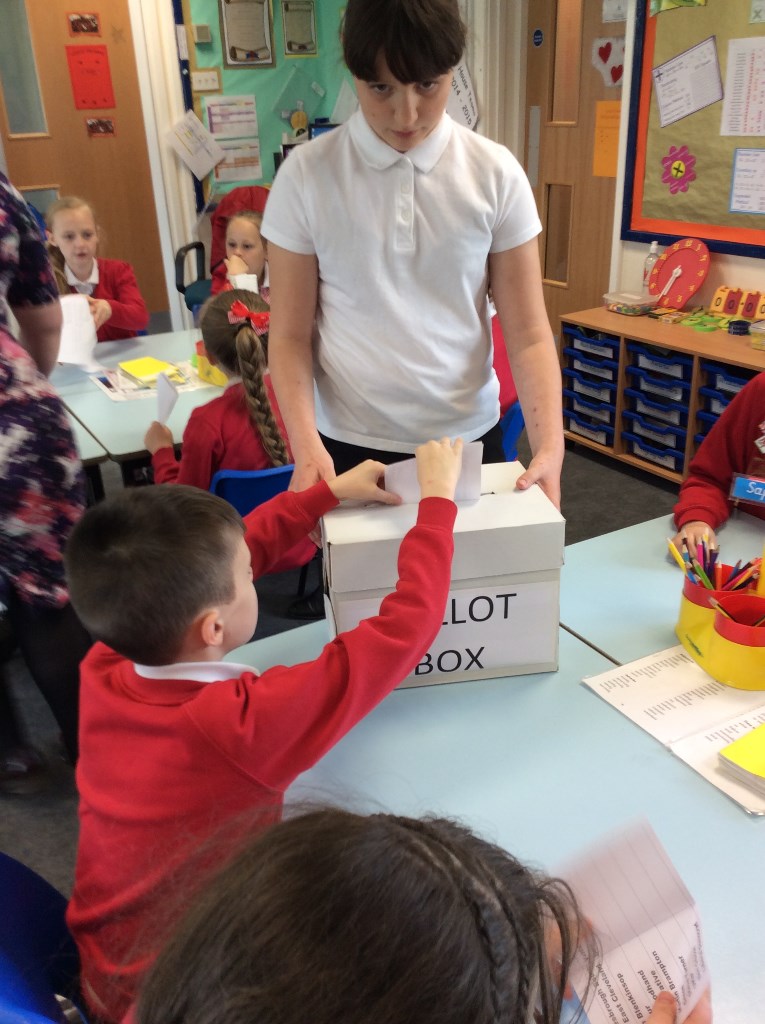 Children in Key Stage 2 got into the voting with their own Ballot Box and Polling Station. Still waiting for the result…