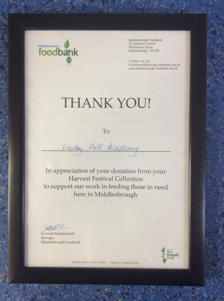 It was lovely to receive a certificate back from Middlesbrough Food Bank to say thank you!