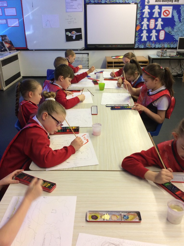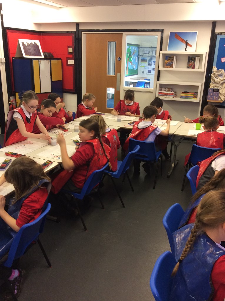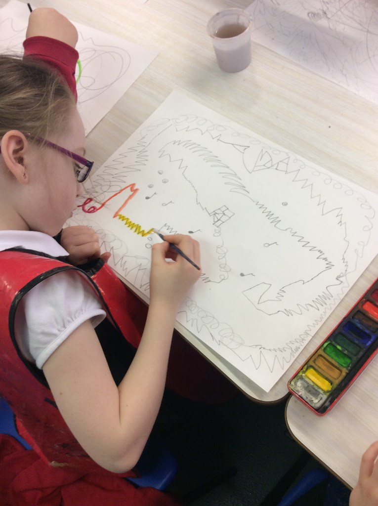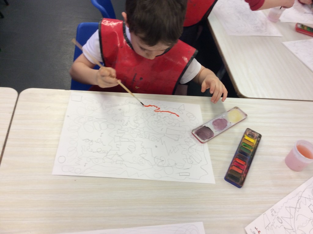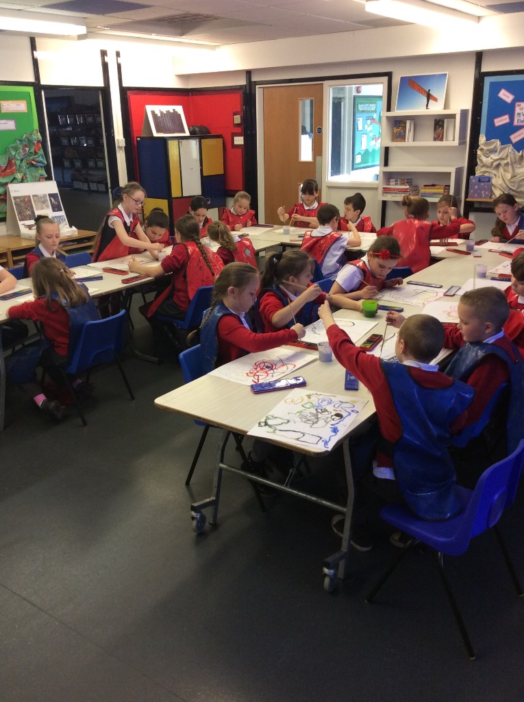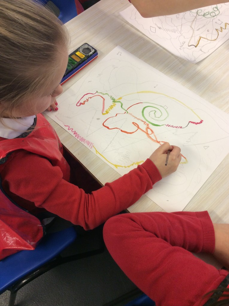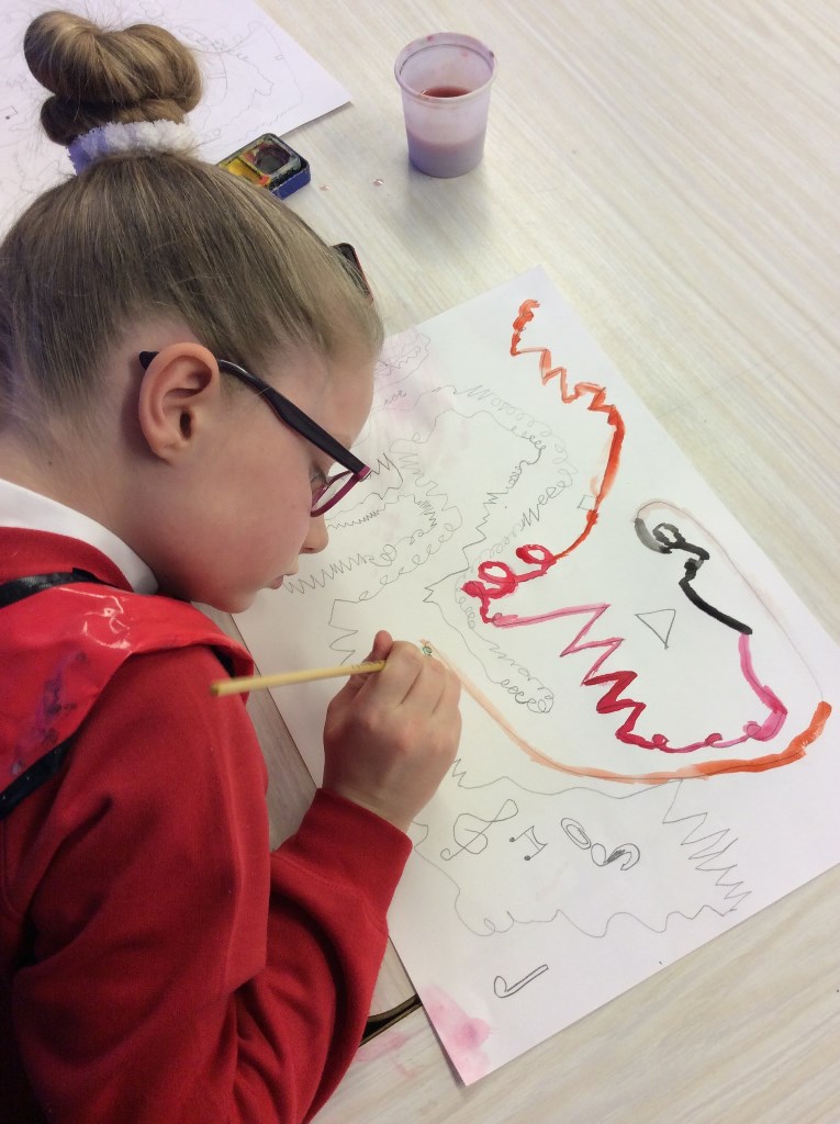 Y4 studied the artist Kandinsky as part of the theme “Playlist”. He liked to listen to music as he painted. Y4 listened to Tchaikowsky as they created their masterpieces in the stlye of Kandinsky.