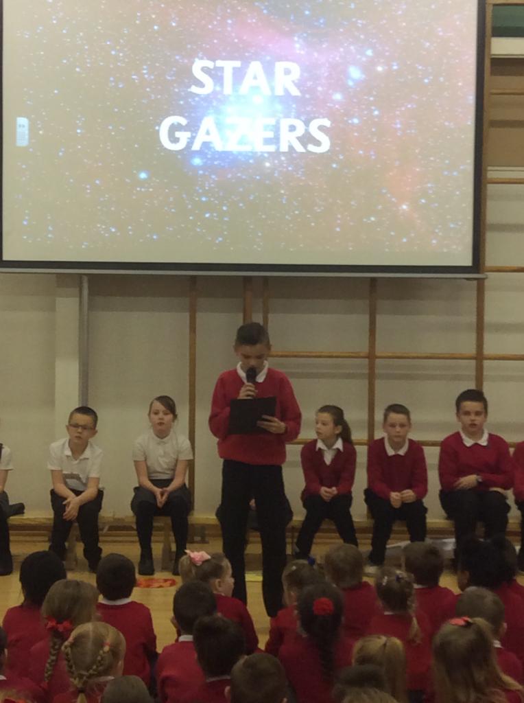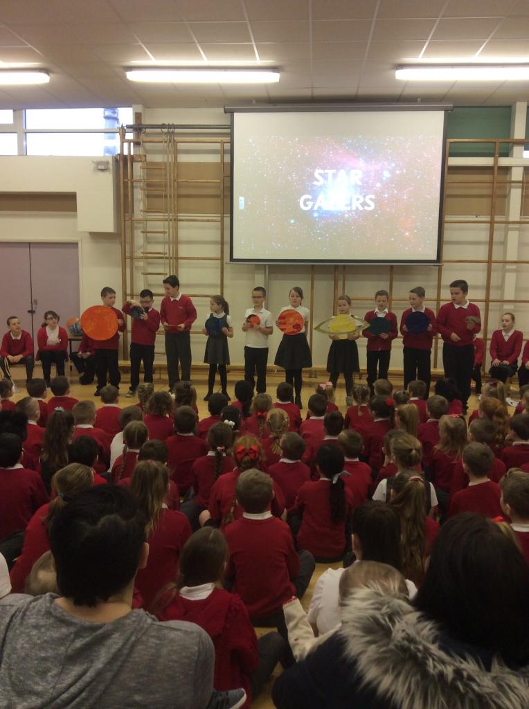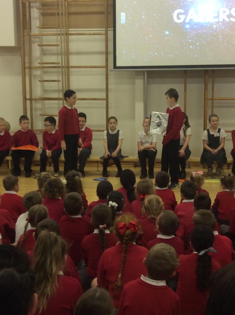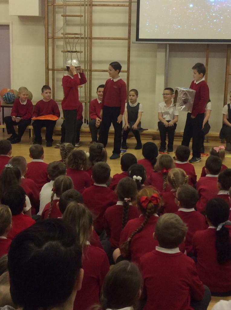 Year 5 were studying the topic of Star Gazers and we got to show off our new knowledge in a class assembly. We have been really interested and excited about this topic! Using card, tissue paper and lots of PVA glue we created our planets of the Solar System and the Sun. In our assembly we used food to compare the sizes of the planets and told everyone how far away we were from the Sun and Pluto (millions of miles). There were guest appearances from Neil Armstrong, Yuri Gagarin and Tim Peake! We also tried to convince our audience to live on Mars forever.